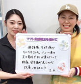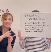 足のむくみや肩こりが辛かったですが施術を受けるといつもすっきりして楽になります。通い始めた頃より足も細くなってダイエット効果もあって嬉しいです。これからもよろしくお願いします!