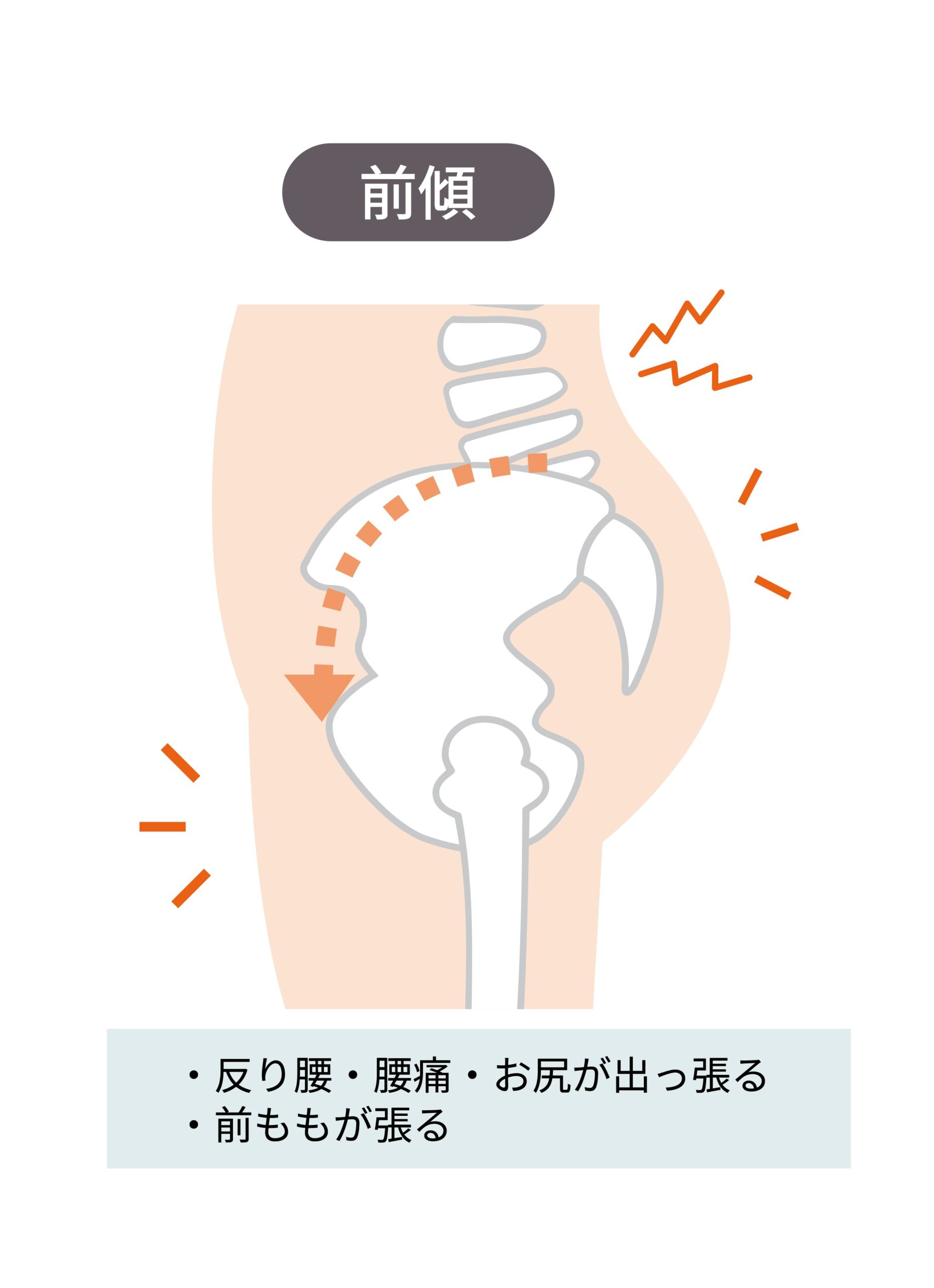 反り腰とは、腰が過度に反った状態のことです。骨盤が前に大きく傾いているため、腰の部分が大きく前に突き出ているように見えます。この姿勢のせいで、腰や背中の筋肉に余計な負担がかかり、腰痛や体の不調が起こることがあります。反り腰になると、腰が反りすぎてお腹が前に出て、ヒップも後ろに突き出た姿勢になります。また、この姿勢の影響で、腰や股関節周りの筋肉が硬くなりやすく、逆にお腹やお尻の筋肉が弱まりやすくなります。これがさらに姿勢を悪化させる原因になります。痛みだけでなくシルエットもぽっこりお腹になり太ももが張りやすいので女性の方でお悩みの方が多いです。