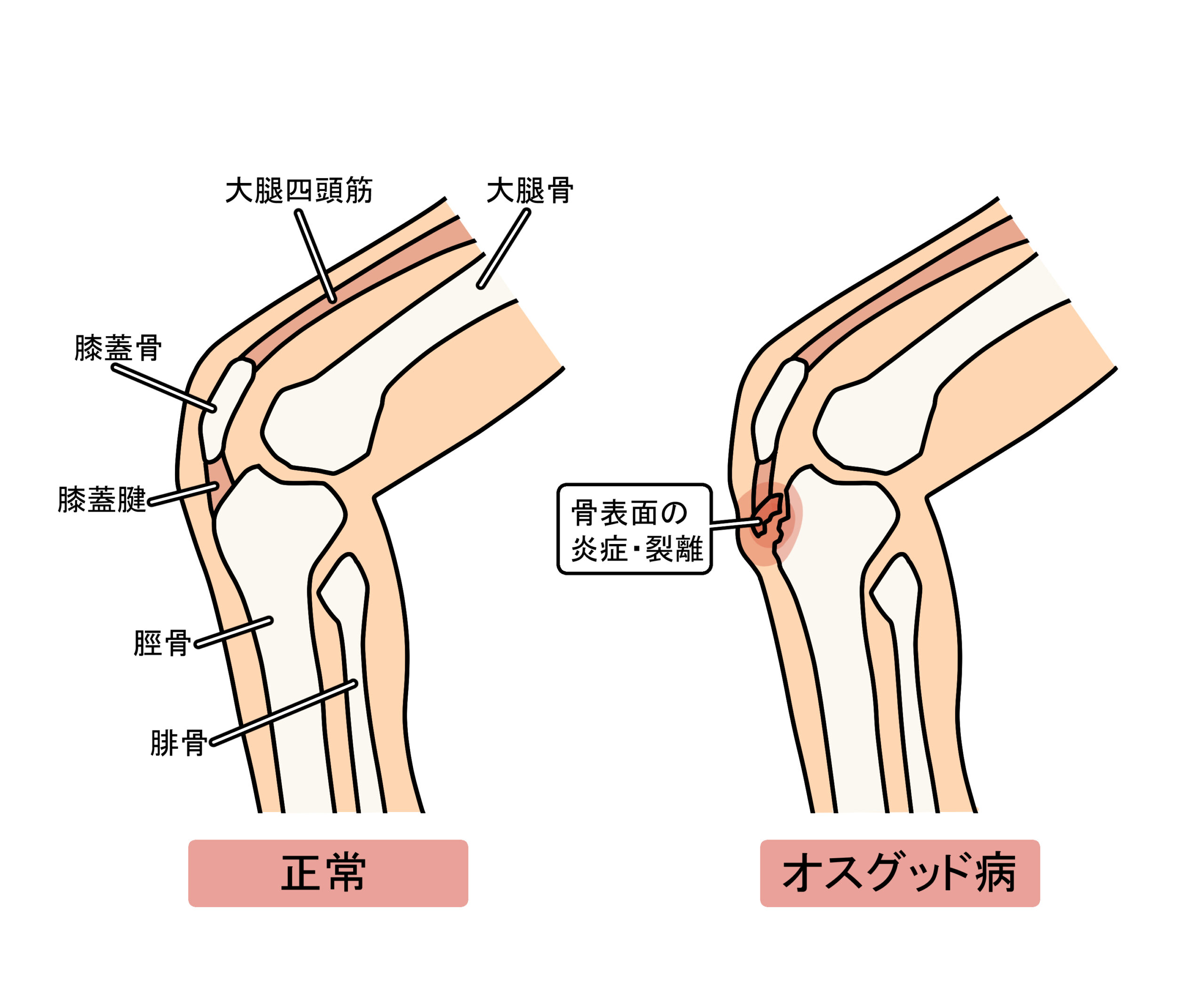 オスグッド(正式名称:オスグッド・シュラッター病)は、主に成長期の子どもや若者によく見られる膝の障害です。特に活発にスポーツを行う10代の子どもに多く発生し、成長期における急激な骨の発達と筋肉や腱の成長速度の不均衡が原因とされています。この疾患は、膝の下に位置する脛骨粗面と呼ばれる部位に痛みや腫れを伴い、ひどい場合には腫れが目立つほど大きくなることもあります。